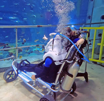 Adapted is a custom underwater wheelchair with an integrated air supply, guided by safety divers who push or pull it. An Aquatic Lift elevates and lowers the chair to and from the underwater trail.